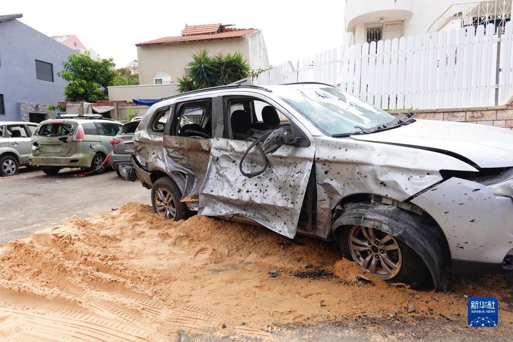 這是10月29日在以色列南部城市阿什杜德拍攝的遭火箭彈襲擊的車(chē)輛。