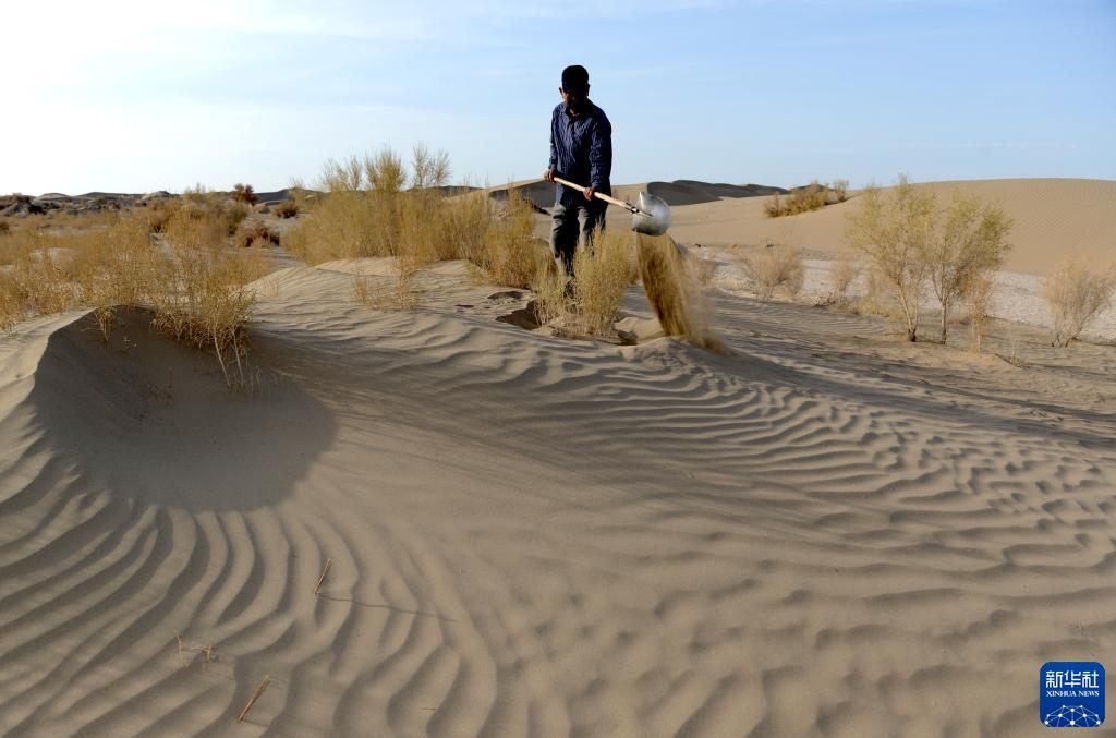 蘇和在內蒙古阿拉善沙漠栽植樹(shù)苗(2014年4月18日攝)。