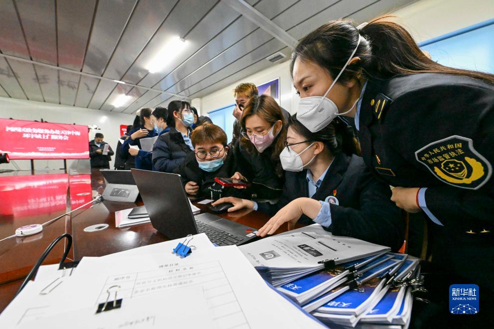 2023年2月22日,在天津市河西區中海環(huán)宇城臨時(shí)辦公點(diǎn),天津市河西區政務(wù)服務(wù)辦公室與天津市河西區市場(chǎng)監管局工作人員為首批入駐的服務(wù)業(yè)商戶(hù)代表提供咨詢(xún)講解服務(wù)。