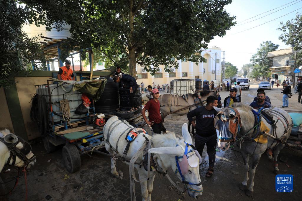 10月30日,因缺乏燃料,人們在加沙地帶南部城市汗尤尼斯使用畜力車(chē)運輸飲用水。