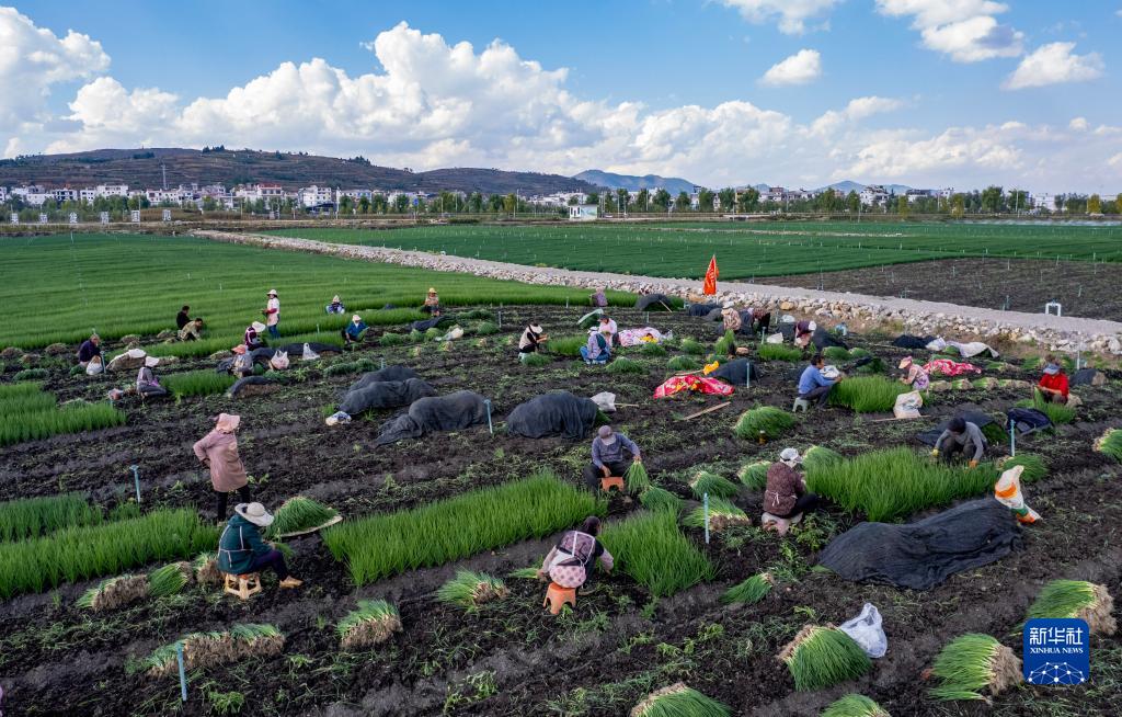 10月30日,農民在魯甸縣一處香蔥種植基地內工作(無(wú)人機照片)。