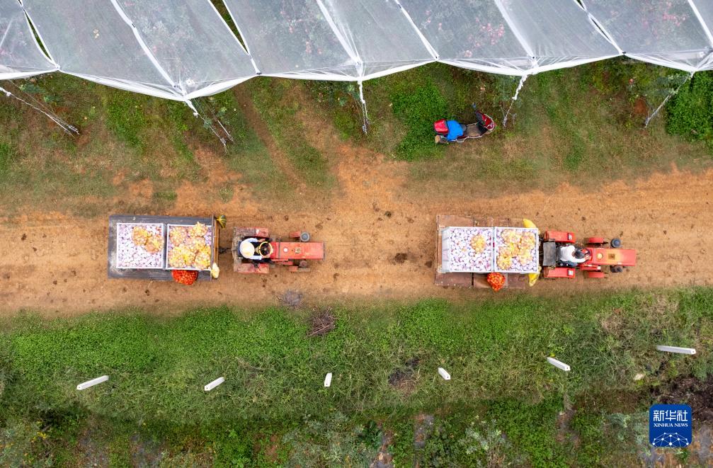 10月30日,果農在昭通市一處蘋(píng)果基地內運送蘋(píng)果(無(wú)人機照片)。