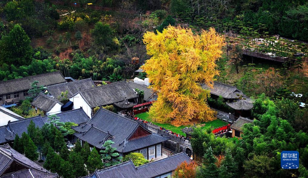深秋時(shí)節,陜西省西安市長(cháng)安區終南山古觀(guān)音禪寺內的千年銀杏滿(mǎn)目金黃,吸引游客參觀(guān)游覽。