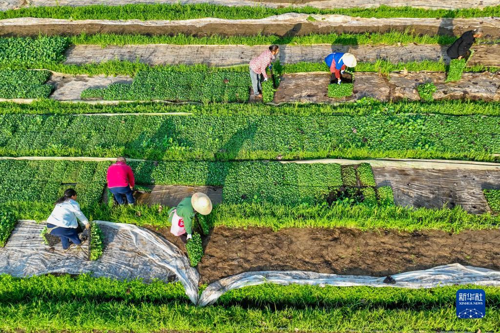 10月31日,在江西省瑞昌市范鎮良田村,龍?chǎng)无r機專(zhuān)業(yè)合作社員工在農田里移栽油菜秧苗(無(wú)人機照片)。