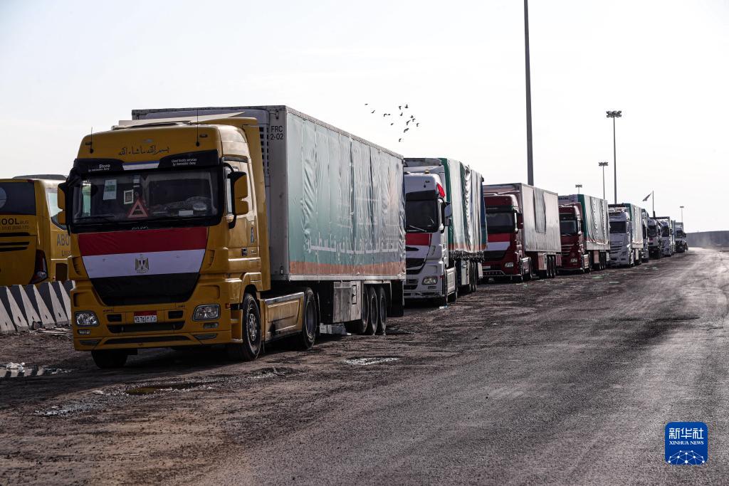 數百輛載有救援物資的卡車(chē)在拉法口岸埃及一側等待進(jìn)入加沙。