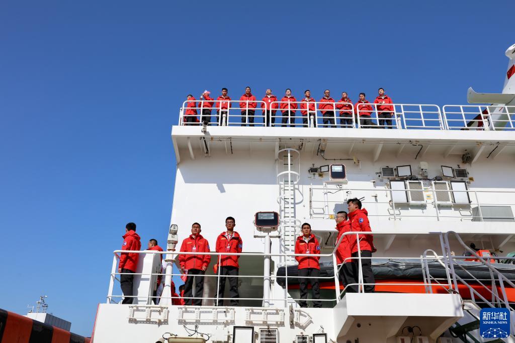 11月1日,在“雪龍2”號極地科學(xué)考察破冰船上,科考隊員在起航前列隊向送行人員告別。