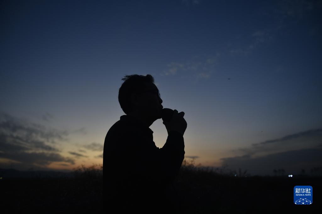 10月31日黃昏時(shí)分,王建在河南省武陟縣黃河岸邊吹奏黃河泥塤。