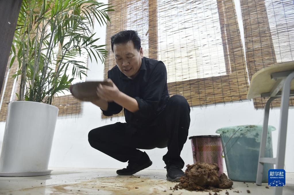 10月31日,王建在河南省武陟縣黃河交通學(xué)院工作室里和泥,準備制作黃河泥塤。