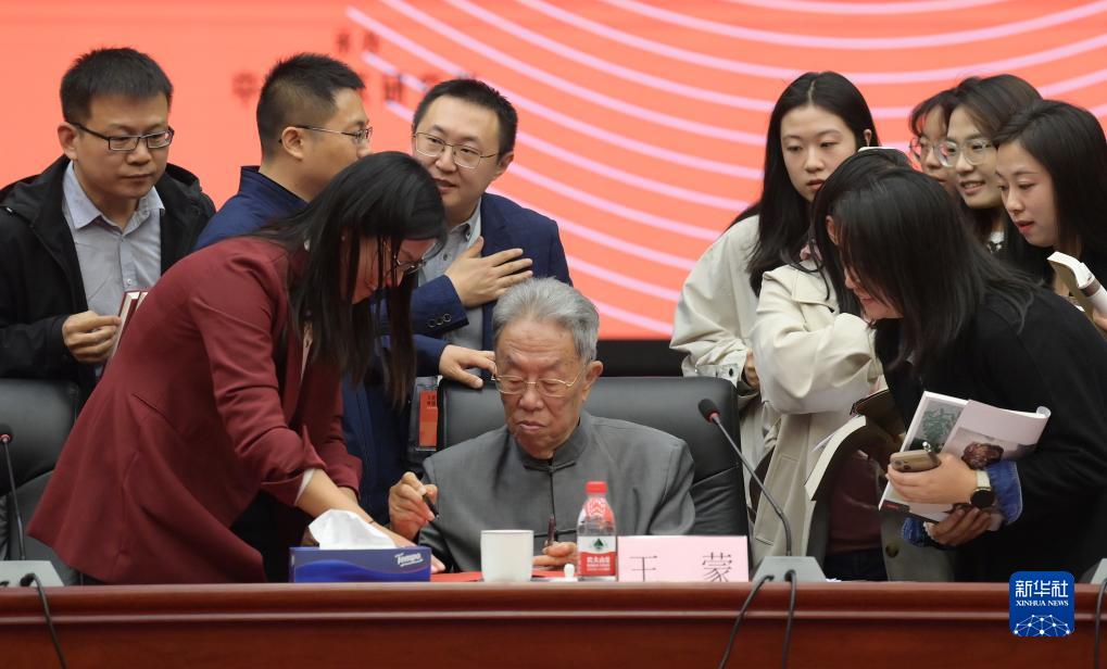 11月1日,文學(xué)愛(ài)好者在會(huì )議休息間隙與作家王蒙(中)交流。