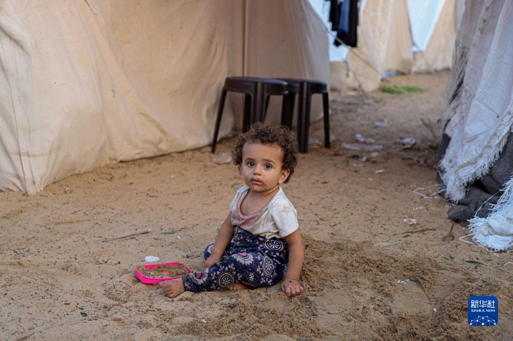 這是11月1日在加沙地帶南部城市汗尤尼斯一處臨時(shí)難民營(yíng)地拍攝的流離失所的兒童。