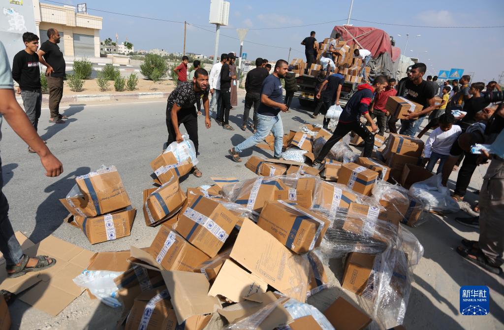 11月2日,在加沙地帶南部,人們從卡車(chē)上卸下人道救援物資。