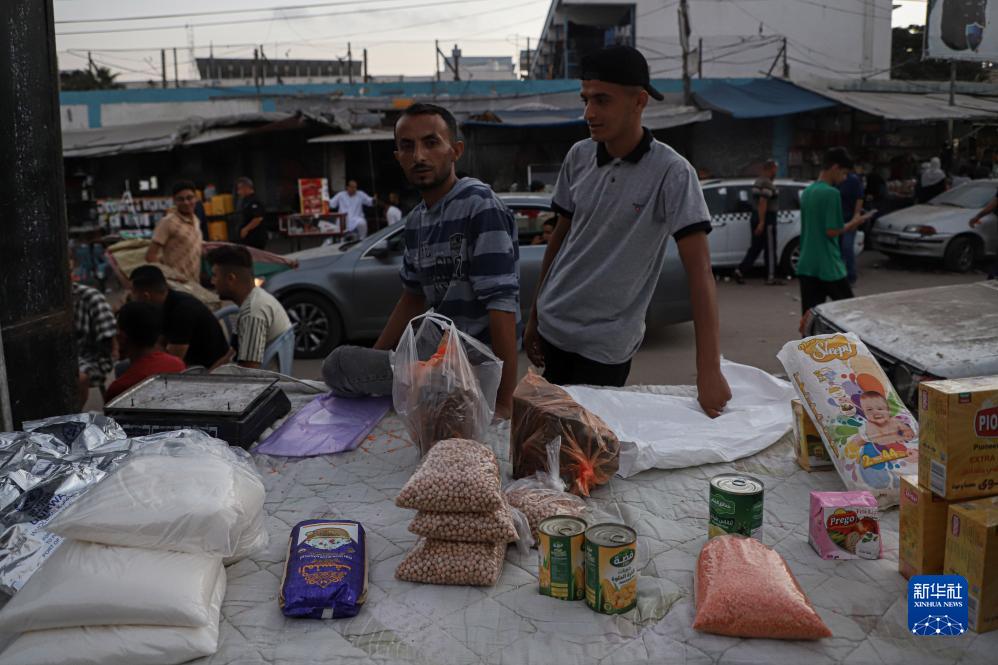 11月2日,人們站在加沙南部城市汗尤尼斯一處市場(chǎng)的貨物前。