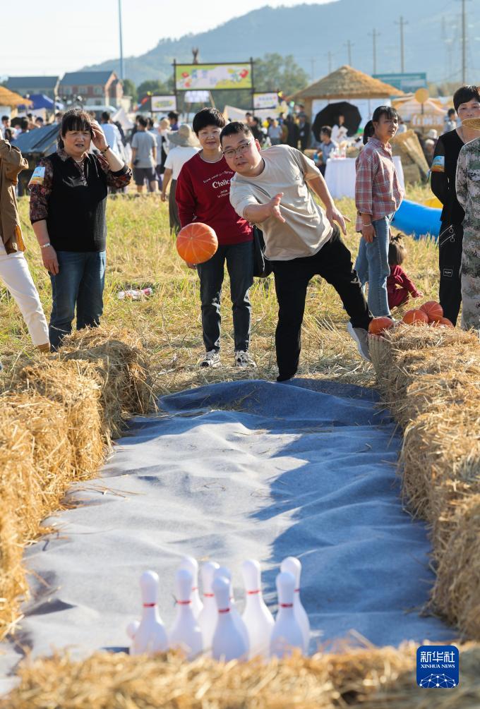 11月2日,游客在豐收市集參加南瓜保齡球趣味游戲。