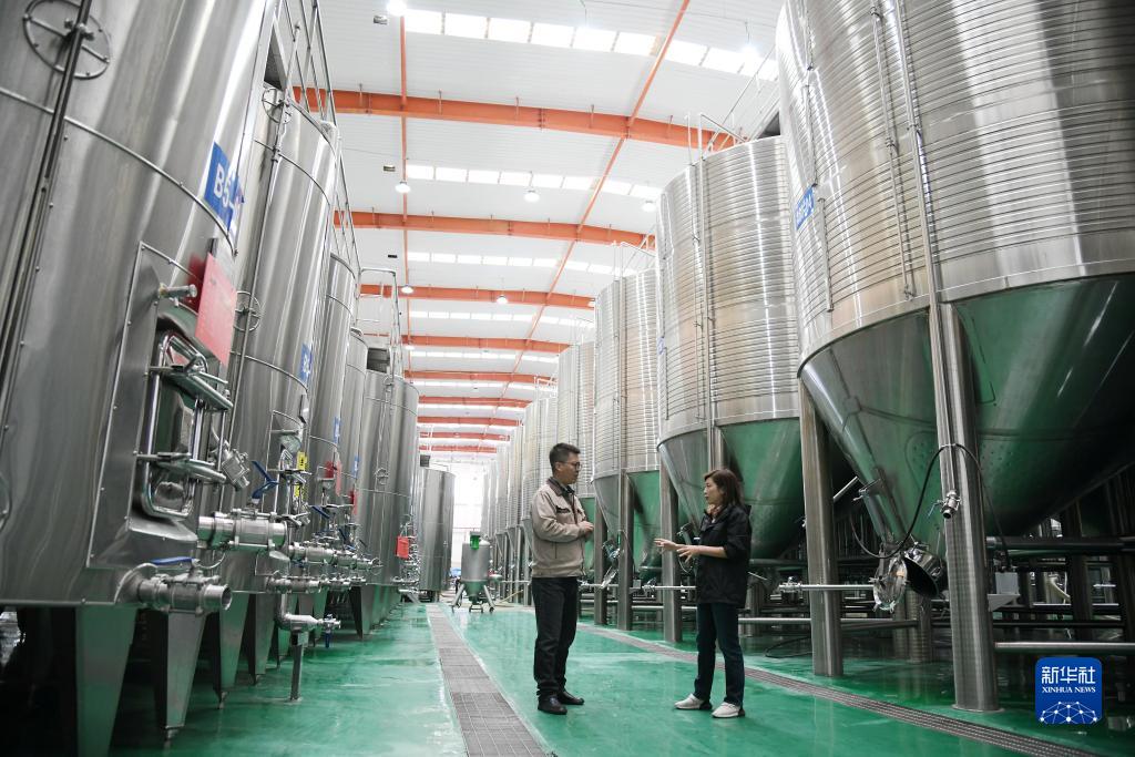 11月2日,在位于陜西省富平縣的云集柿業(yè)富平柿園綜合項目柿酒發(fā)酵車(chē)間,云集柿業(yè)總經(jīng)理王薇(右)和生產(chǎn)副廠(chǎng)長(cháng)張文裕檢查生產(chǎn)設備。
