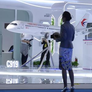 11月3日在中國東方航空公司展臺拍攝的擁有該航司涂裝的國產(chǎn)C919飛機模型。