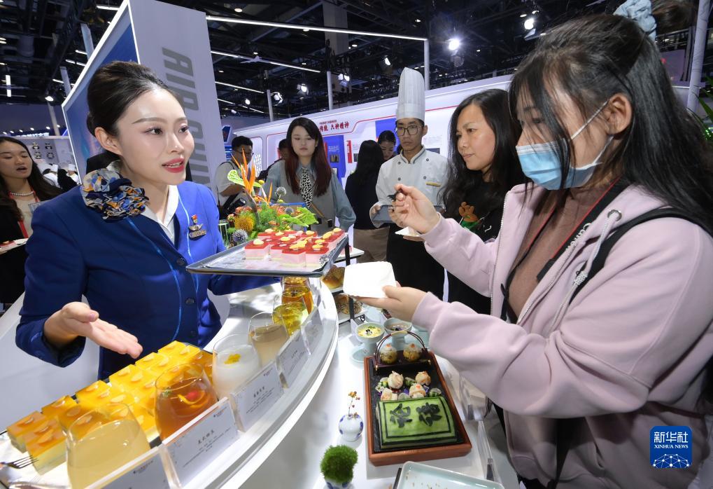 11月3日,來(lái)自中國國際航空公司的空乘人員(左)在展臺邀請參觀(guān)者品嘗航食。