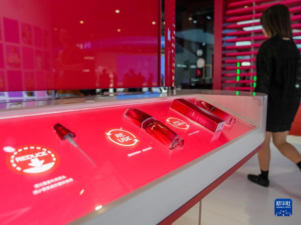 11月5日在第六屆進(jìn)博會(huì )消費品展區資生堂展臺拍攝的紅腰子空瓶。資生堂在進(jìn)博會(huì )上首發(fā)首秀的“紅腰子空瓶再續計劃”,可讓化妝品空瓶實(shí)現100%循環(huán)使用。