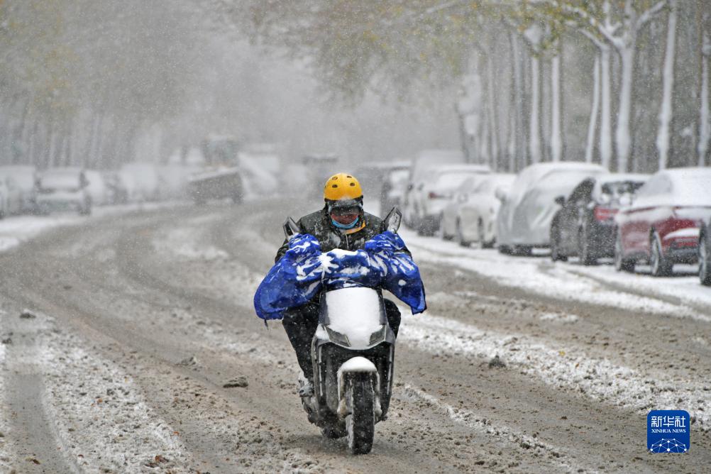 11月6日,在沈陽(yáng)市渾南區,外賣(mài)員在雪中送外賣(mài)。