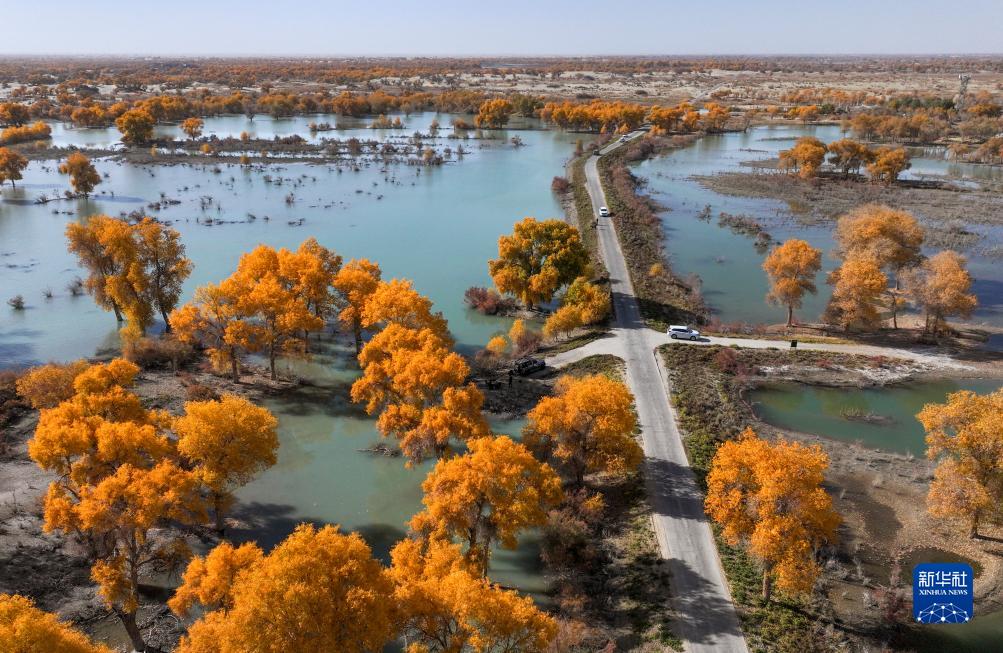 游客在新疆尉犁縣羅布淖爾國家濕地公園自駕觀(guān)光(11月4日攝,無(wú)人機照片)。