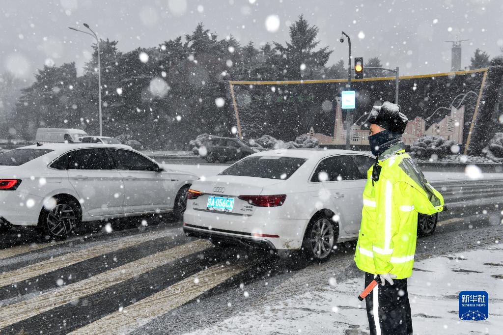 11月6日,在長(cháng)春市街頭,一名執勤交警在雪中指揮交通。