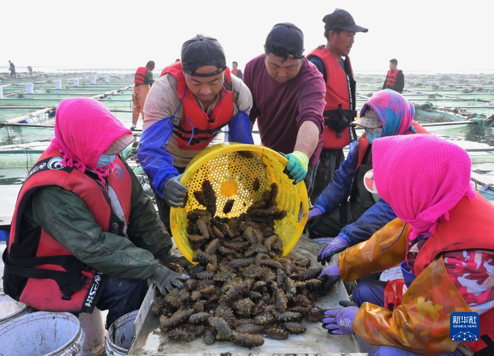 11月6日,河北省唐山市曹妃甸區一家深海網(wǎng)箱海參養殖合作社的社員在分揀剛捕撈的海參。