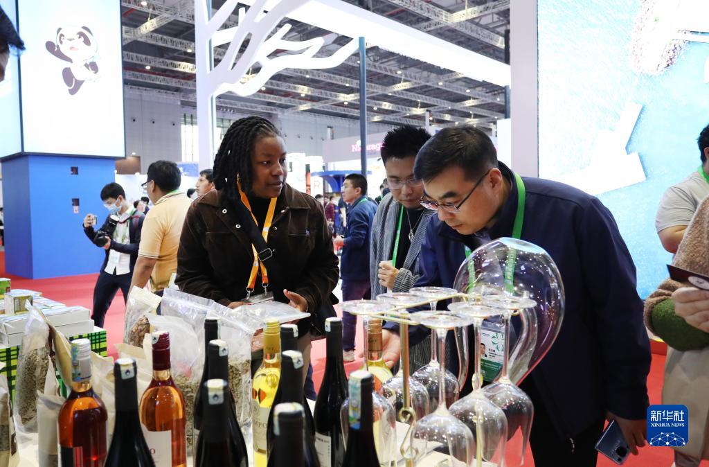 11月6日,來(lái)自坦桑尼亞的艾斯黛拉(前左)向參觀(guān)者介紹展品。今天是艾斯黛拉來(lái)中國的第二天,她表示參加進(jìn)博會(huì )讓她感到很高興。艾斯黛拉說(shuō)等進(jìn)博會(huì )閉幕后她要在上海游覽一下,希望自己的公司能在中國找到合作伙伴。