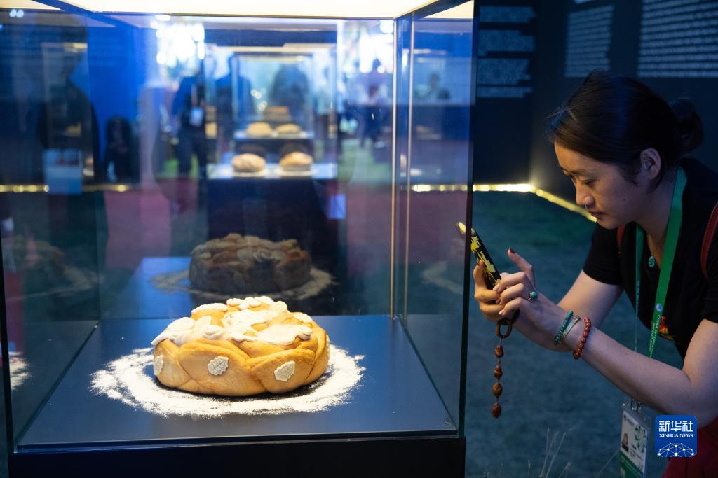 11月6日,參觀(guān)者在第六屆進(jìn)博會(huì )國家展塞爾維亞展臺欣賞塞爾維亞面包。