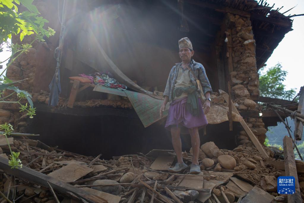 11月6日,一名男子站在尼泊爾西部扎澤爾果德地震災區的建筑物廢墟前。
