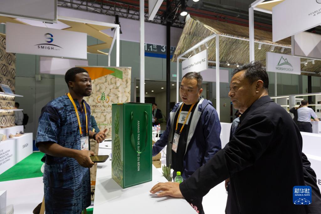 11月6日,在第六屆進(jìn)博會(huì )食品及農產(chǎn)品展區,貝寧投資和出口促進(jìn)局工作人員(左)在接待前來(lái)咨詢(xún)的客戶(hù)。