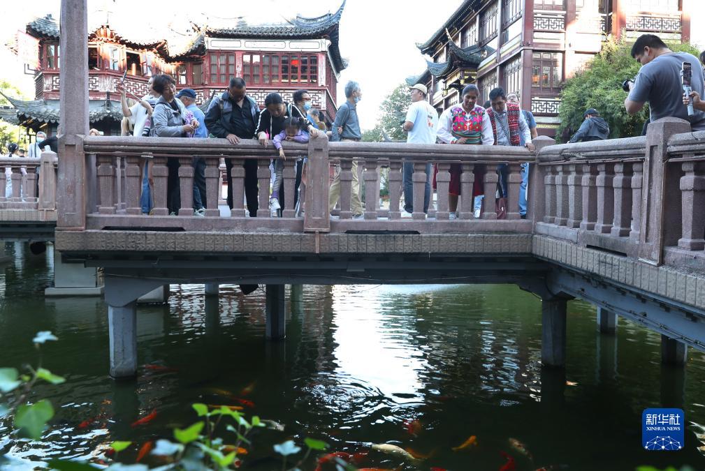 馬馬尼大叔和妻子格洛麗亞在上海豫園游玩時(shí)觀(guān)看水中的錦鯉(11月2日攝)。