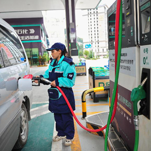 11月7日,山東省滕州市一加油站工作人員在給汽車(chē)加油。