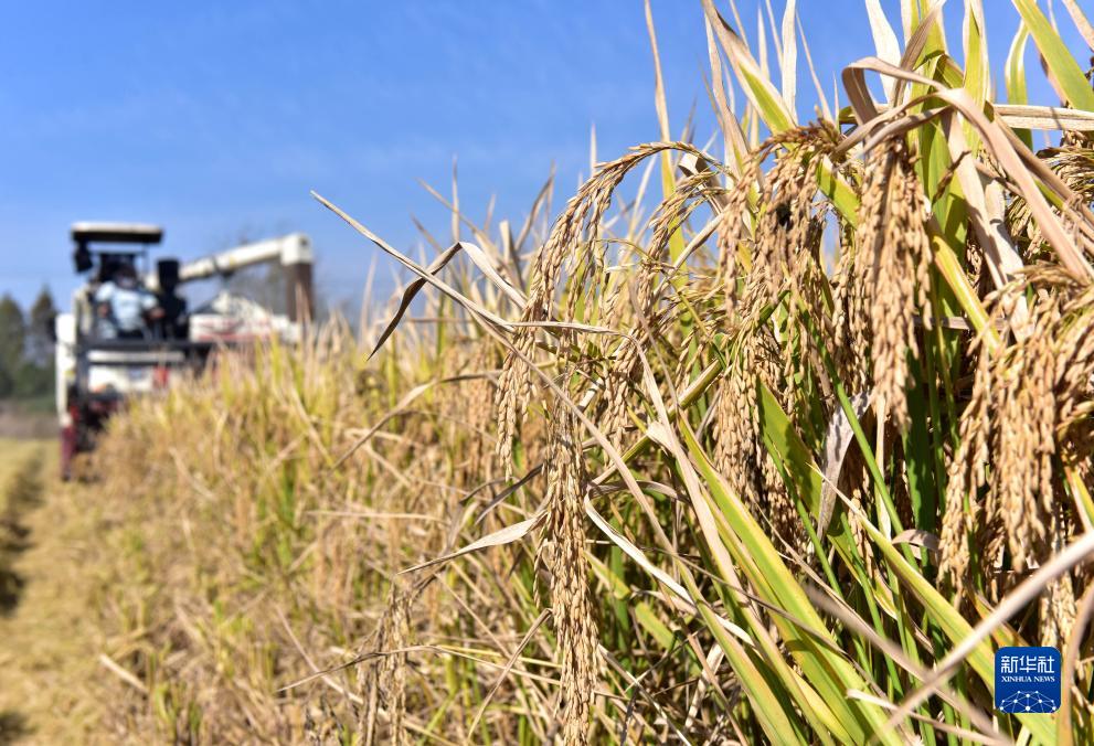 11月8日,在安徽省巢湖市中垾鎮慶樹(shù)家庭農場(chǎng),農機手駕駛收割機在田間收割水稻。