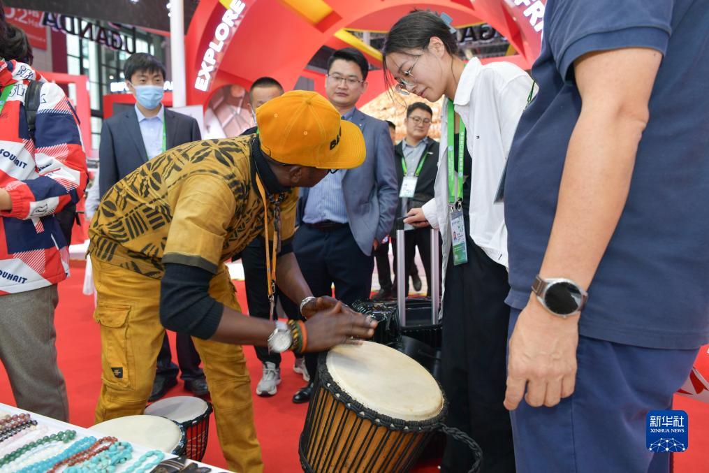 11月8日,在第六屆進(jìn)博會(huì )國家展馬里共和國館,展商向觀(guān)眾介紹非洲鼓。