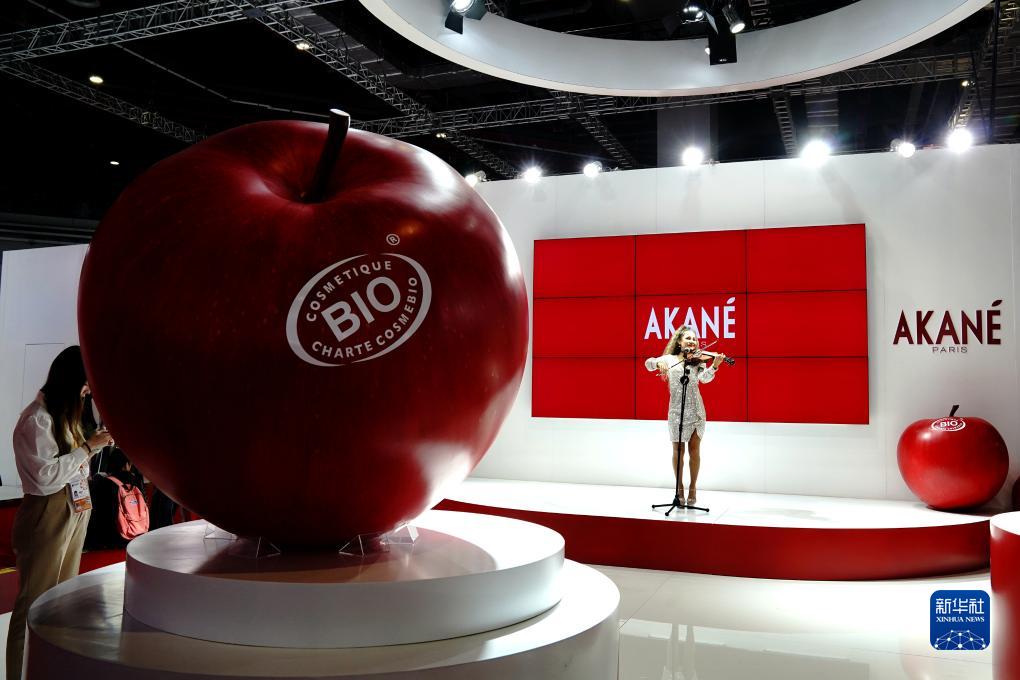 11月7日,在第六屆進(jìn)博會(huì )消費品展區,演員在化妝品AKANE展臺上進(jìn)行小提琴表演。