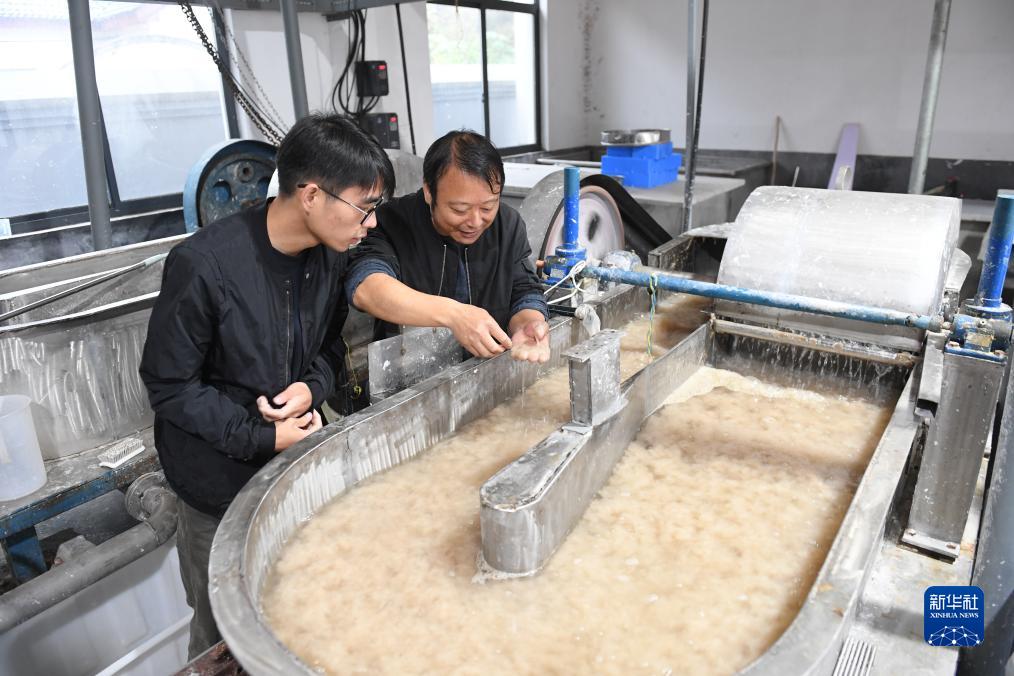 11月9日,在開(kāi)化紙傳統技藝工坊,黃宏?。ㄓ遥┖蛢鹤狱S鑫康在查看紙漿的勻度。