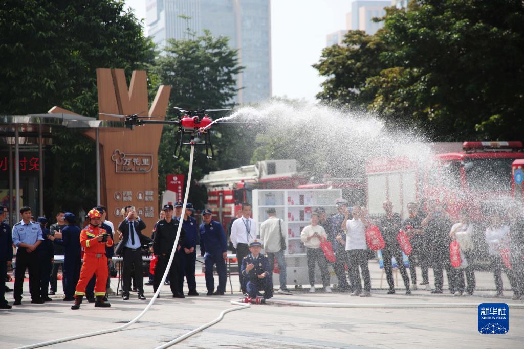 11月9日,在福建省龍巖市萬(wàn)寶廣場(chǎng),消防員向市民演示無(wú)人機高空滅火。