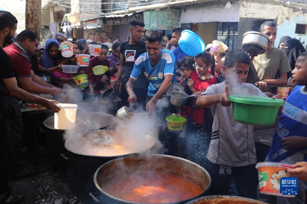 11月9日,在加沙地帶南部城市拉法,人們在一個(gè)臨時(shí)分發(fā)點(diǎn)排隊領(lǐng)取食物。