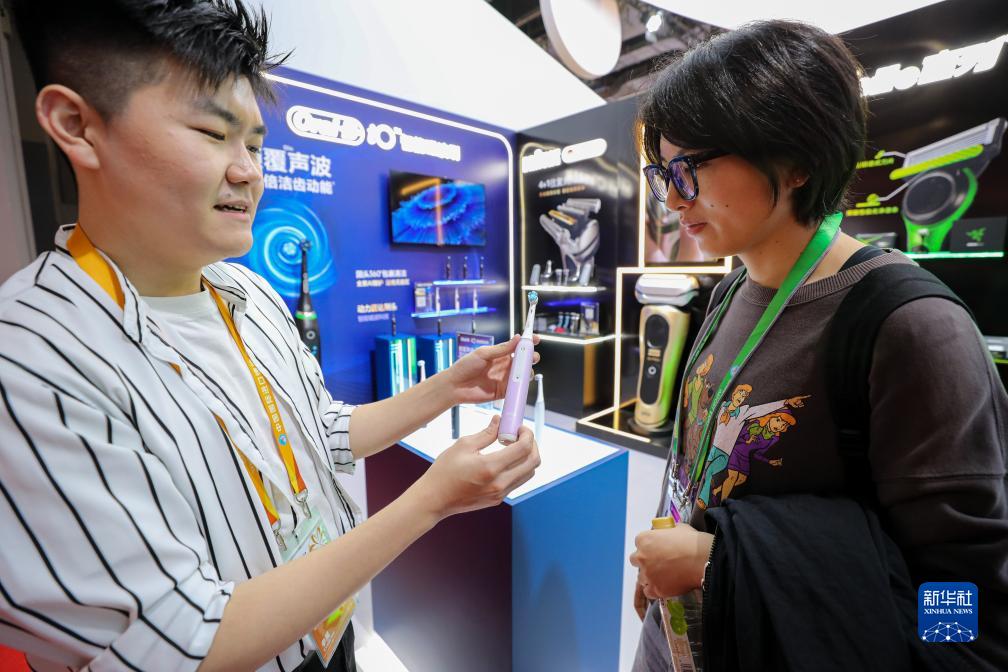 11月8日,寶潔公司工作人員在第六屆進(jìn)博會(huì )消費品展區向觀(guān)眾介紹歐樂(lè )B電動(dòng)牙刷。