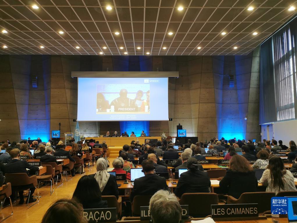 這是11月9日在法國巴黎拍攝的聯(lián)合國教育科學(xué)文化組織第42屆大會(huì )現場(chǎng)。