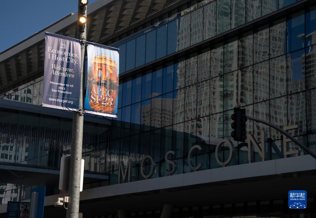 這是11月7日在美國舊金山拍攝的亞太經(jīng)合組織會(huì )議場(chǎng)地外的宣傳海報。