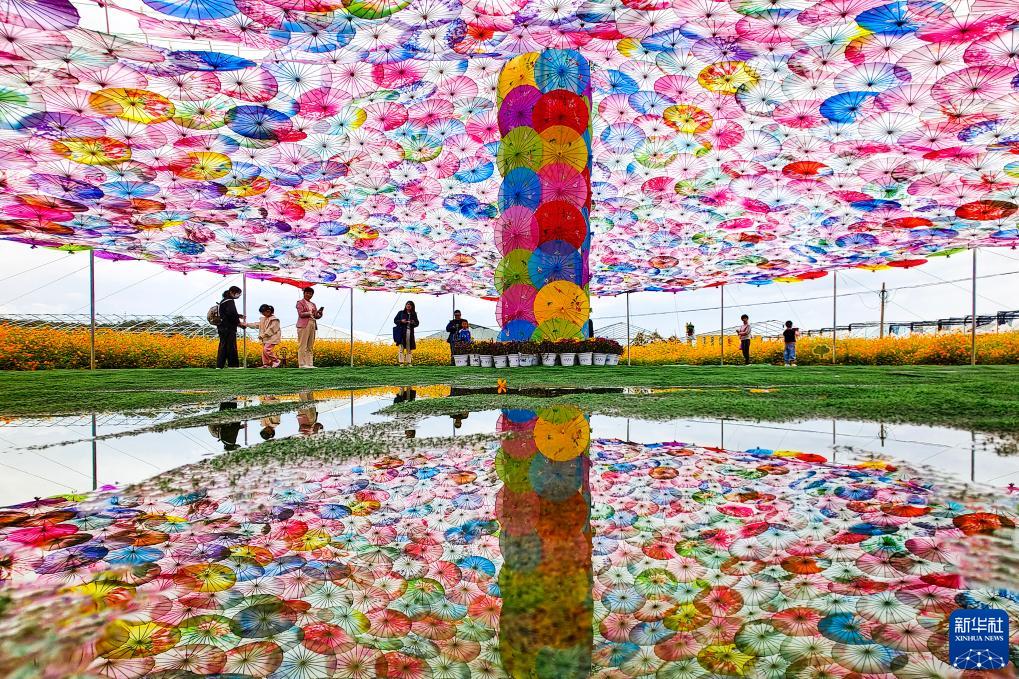 11月11日,游客在寧波市寧??h力洋鎮海頭村的傘棚下游玩賞花。