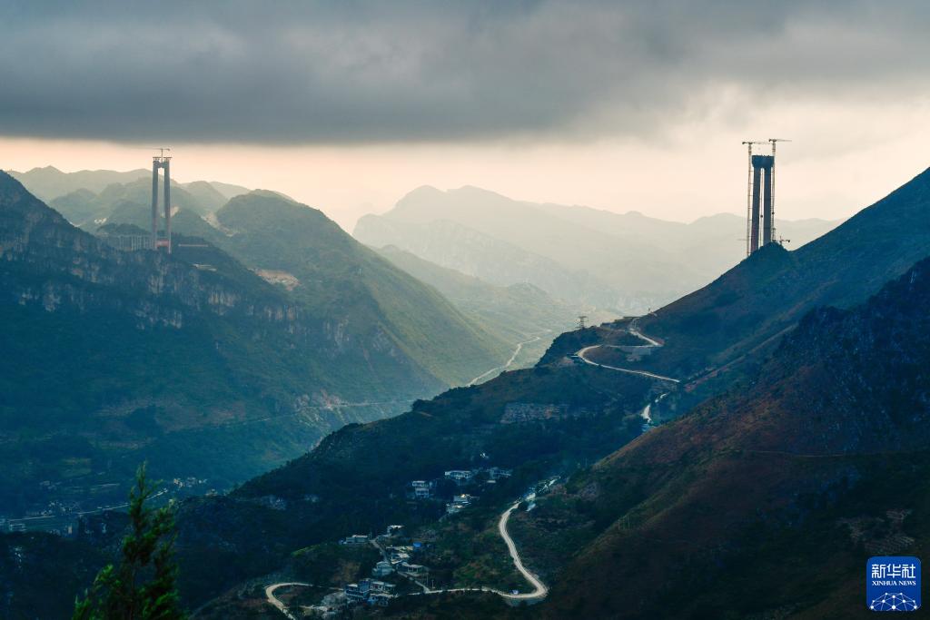 這是11月7日拍攝的貴州六安高速花江峽谷大橋兩岸主塔。