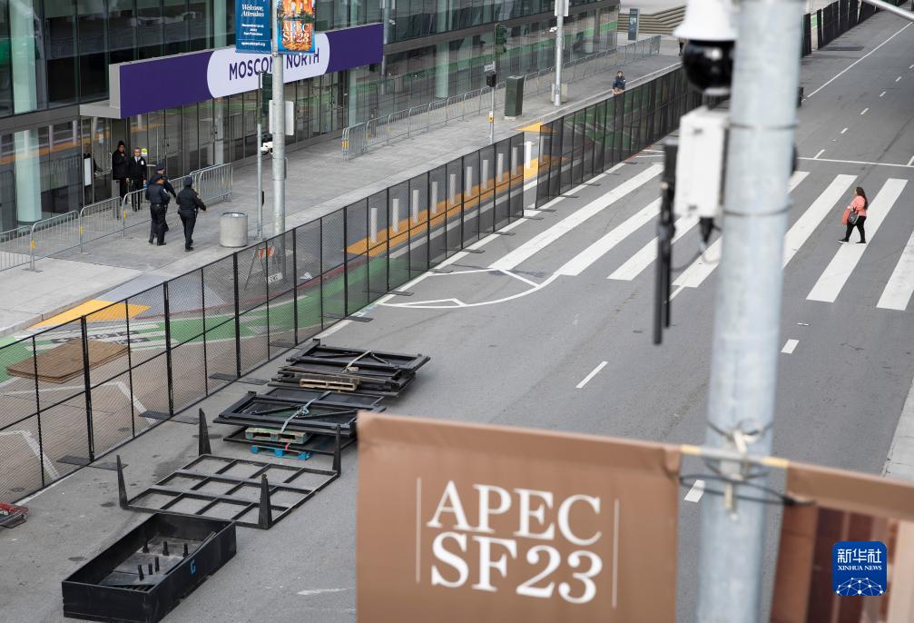 11月10日,在美國舊金山,亞太經(jīng)合組織會(huì )議場(chǎng)地外豎起金屬?lài)鷻凇?/p>