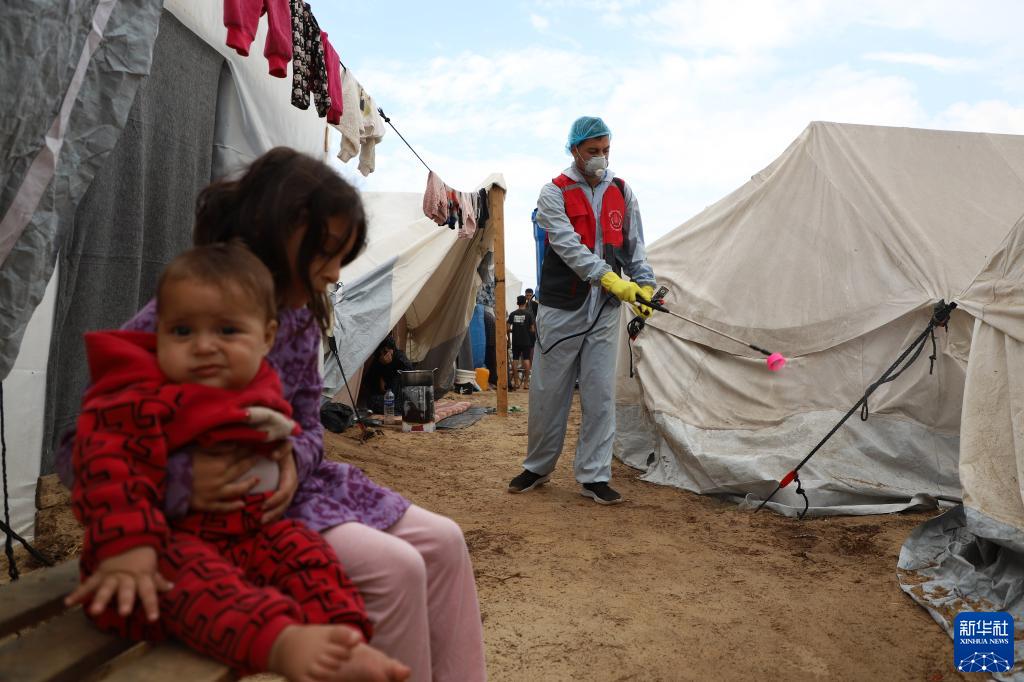 11月12日,工作人員在加沙地帶南部城市汗尤尼斯一處臨時(shí)難民營(yíng)噴灑消毒液。