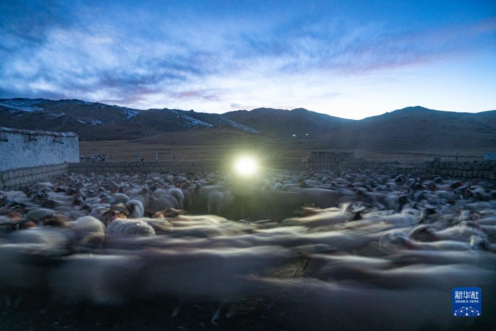 在西藏當雄縣納木湖鄉達布村的冬季放牧點(diǎn),云丹的父親玉珠在清點(diǎn)羊群數量(11月10日攝)。