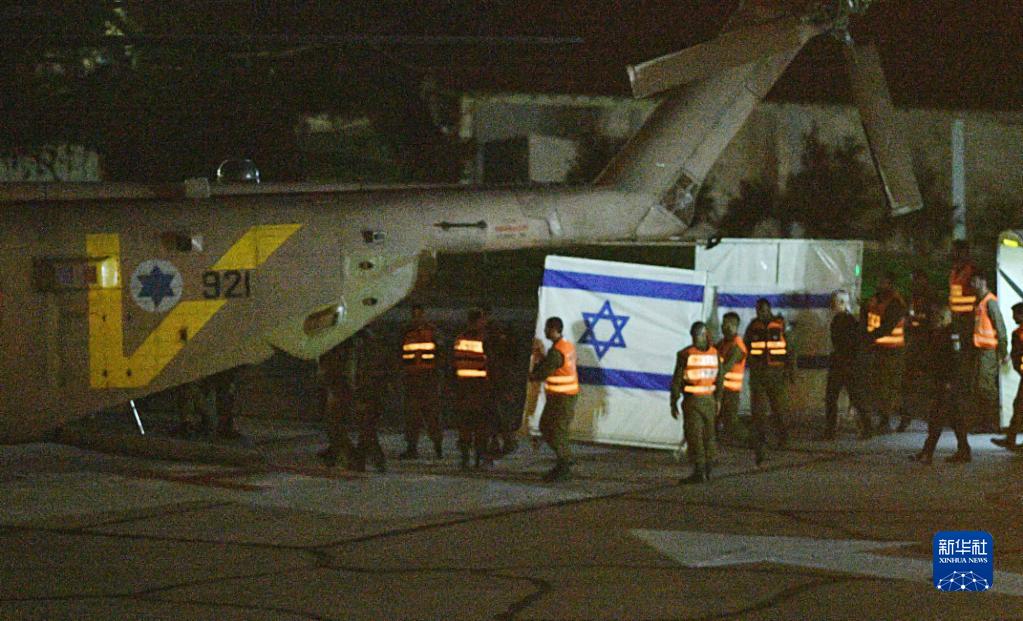 11月24日,搭載獲釋人員的直升機抵達以色列佩塔提克瓦一所醫院。
