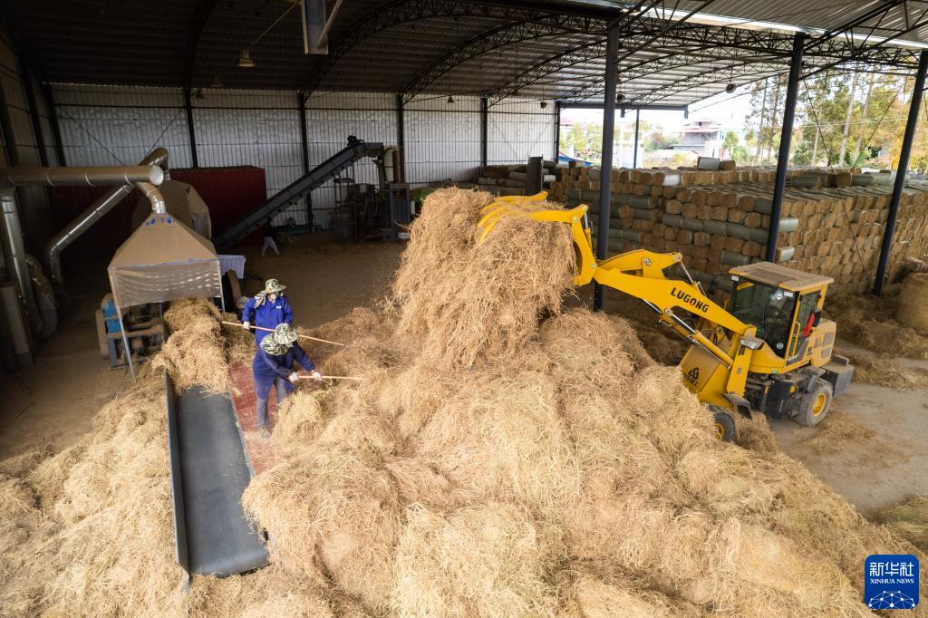近日,在湖南省益陽(yáng)市南縣武圣宮鎮沿河堤村的稻草飼料化項目現場(chǎng),工人們忙著(zhù)將成捆秸稈進(jìn)行打散篩選,送入飼料化生產(chǎn)線(xiàn)。秸稈經(jīng)過(guò)切碎、震蕩過(guò)篩、風(fēng)選除塵、壓縮打包等工序后,即可成為牛羊飼草。據悉,該基地每年秸稈離田收儲能力可達1萬(wàn)噸、年飼料化加工能力8000噸,每噸毛利潤約400元。