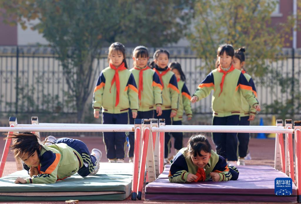 11月27日,河北省石家莊市仁華小學(xué)學(xué)生在大課間進(jìn)行“匍匐前進(jìn)”游戲。