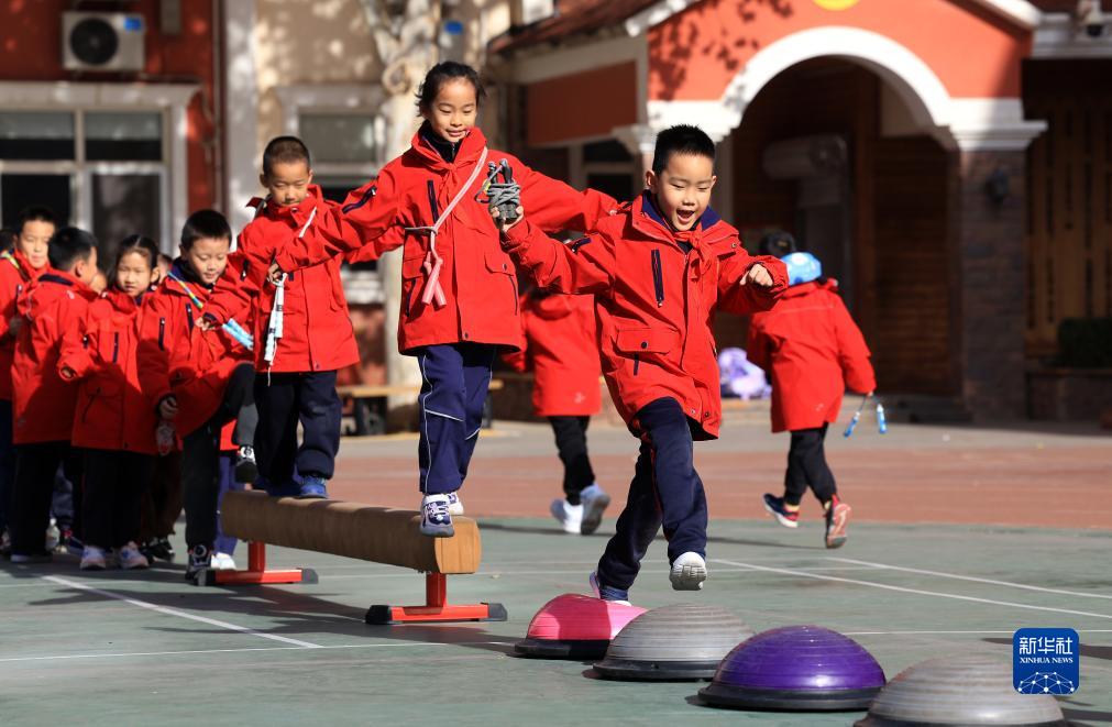 11月27日,河北省石家莊市翟營(yíng)大街小學(xué)學(xué)生在大課間進(jìn)行“平衡球跳躍”游戲。