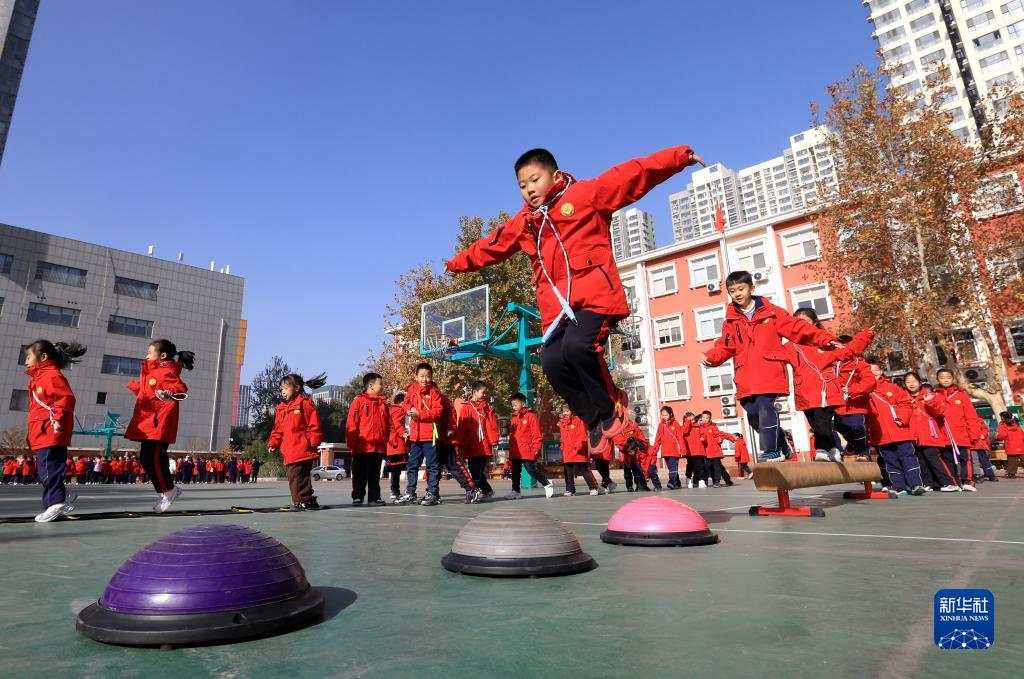 11月27日,河北省石家莊市翟營(yíng)大街小學(xué)學(xué)生在大課間進(jìn)行“平衡球跳躍”游戲。